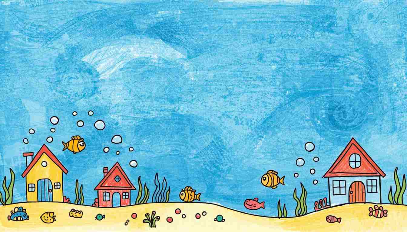 Picture of a big blue sea, with small houses for fish inside, and a happy fish family, and lots of bubbles in the water. It’s a kids imagery design.