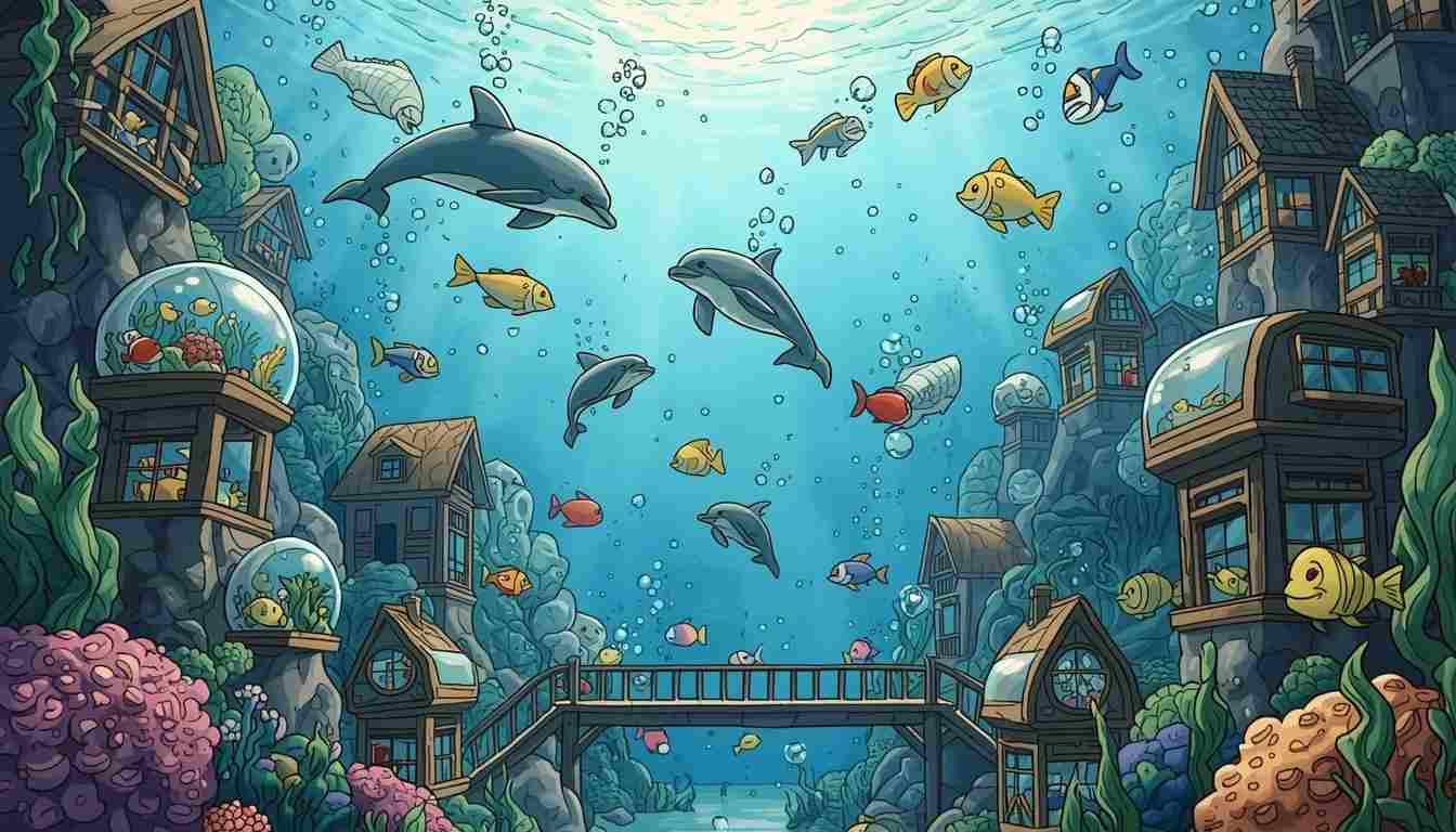 An underwater city where dolphins, turtles, and fish live in tiny glass houses, ride bubble buses, and have a seaweed playground.