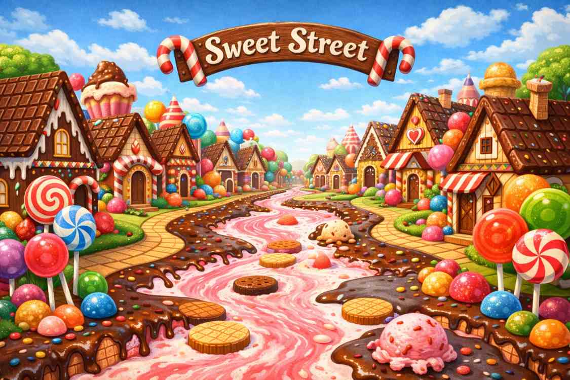 An amazing image named “Candy Land Street” is a street where all the houses are made of candy: chocolate roofs, lollipop trees, and rivers of melted ice cream. The image is made for kids. It can be used for learning purpose.