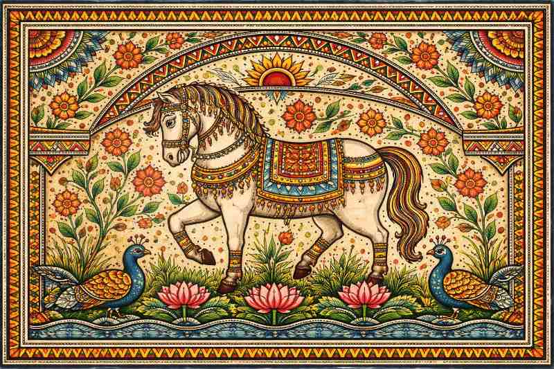 • Style: Traditional Madhubani / Mithila folk art horse motif